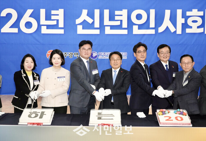 | ▲ 강기정 광주광역시장(사진 가운데)이 19일 광주테크노파크에서 열린 '2026 지산학연 거버넌스 신년인사회'에 참석해 참석자들과 떡케이크 커팅을 하고 있다. /광주광역시 제공 |