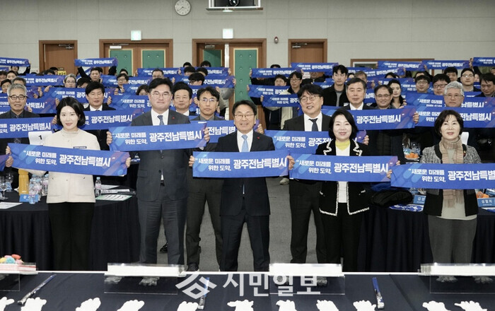 | ▲ 강기정 광주광역시장(사진 앞줄 가운데)이 19일 광주테크노파크에서 열린 '2026 지산학연 거버넌스 신년인사회'에 참석해 참석자들과 광주전남특별시 추진 피켓 퍼포먼스를 하고 있다. /광주광역시 제공 |