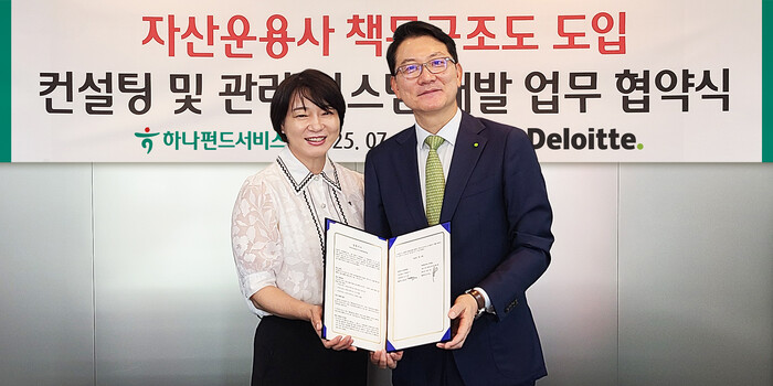 이번 협약을 통해 하나펀드서비스와 딜로이트 안진은 각사의 전문성과 폭넓은 금융 네트워크를 결합하여 책무구조도 도입에 어려움을 겪고 있는 중소형 자산운용사를 위한 맞춤형 컨설팅과 최적화된 솔루션을 제공키로 했다.