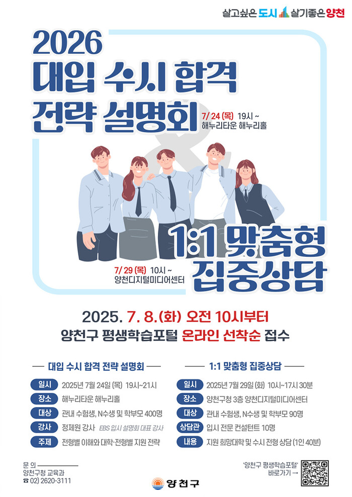 신청 대상은 지역내 수험생과 학부모이며 8일 오전 10시부터 ‘양천구 평생학습포털’에서 총 90명을 사전 신청 받는다. 상담료는 전액 무료다.