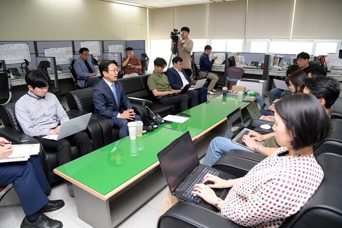 | ▲ 강기정 광주광역시장이 15일 오후 시청 기사송고실에서 출입기자단과 차담회를 갖고 5.18기념주간과 관련해 의견을 밝히고 있다./광주광역시 제공 |