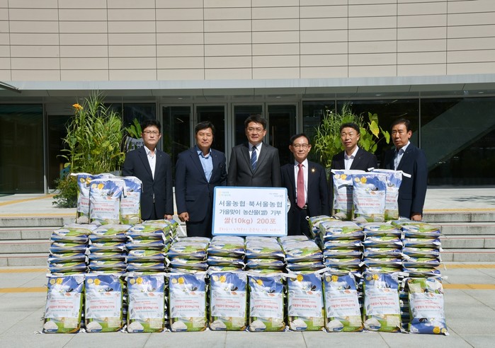 서울 노원구는 21일 농협중앙회 서울지역본부와 북서울농협으로부터 쌀 10kg·200포를 전달받았다. 사진은 전달식에서 오승록 구청장(왼쪽 세 번째)이 관계자들과 기념촬영을 하고 있는 모습. (사진제공=노원구청)