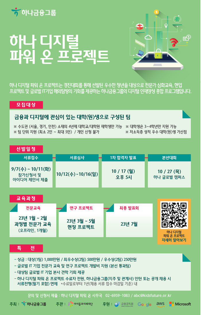 금융감독원과 구글, 아마존웹서비스(AWS), 마이크로소프트의 후원으로 개최되는 이번 '하나 디지털 파워 온 프로젝트'의 참가신청은 오는 10월11일까지 하나은행 대표 모바일 앱 ‘하나원큐’와 하나금융그룹 홈페이지에서 하면 된다.