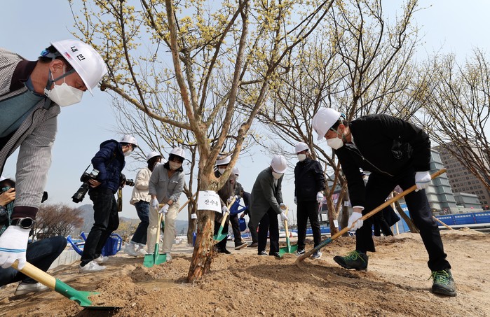 오세훈 서울시장과 시민들이 5일 오전 서울 종로구 광화문광장 공사현장에 산수유 나무를 심고 있다.