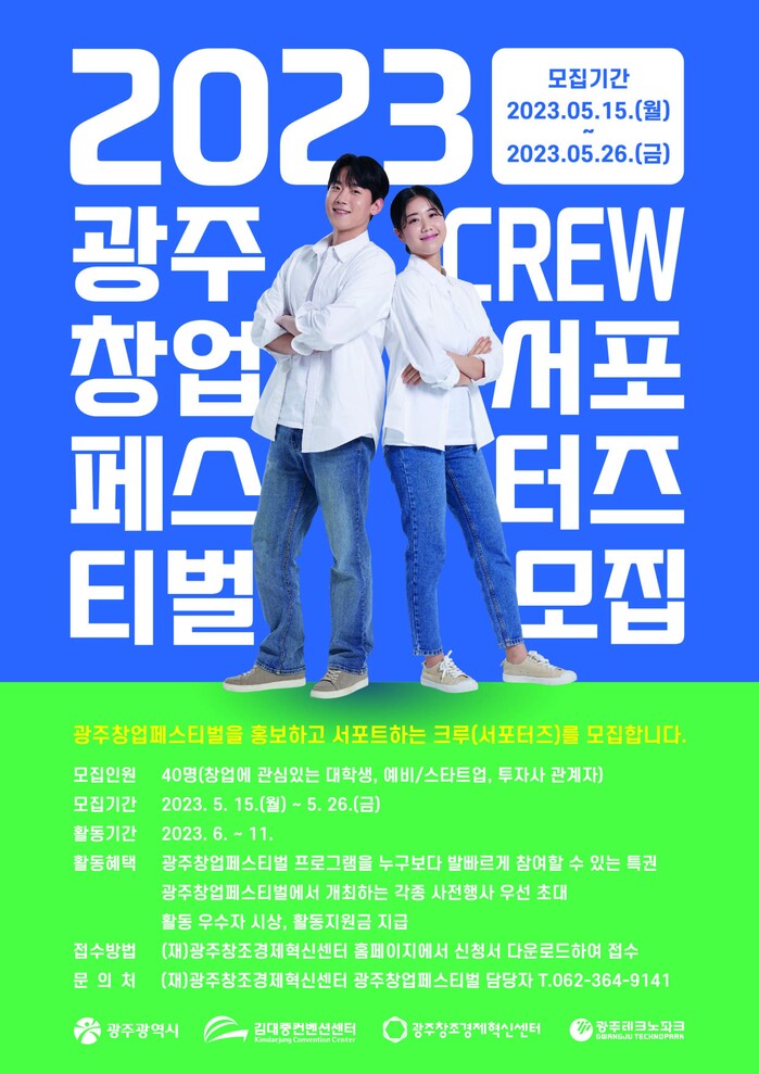 아울러 2023 광주창업페스티벌 홍보단(크루)은 창업에 관심 있는 대학생부터 창업기업, 투자사 등 누구나 지원이 가능하며 개인 뿐 아니라 단체로도 신청이 가능하다. 홍보단(크루)은 사회관계망서비스(SNS)에 자유로운 방식으로 광주창업페스티벌 홍보 활동을 하게 된다.