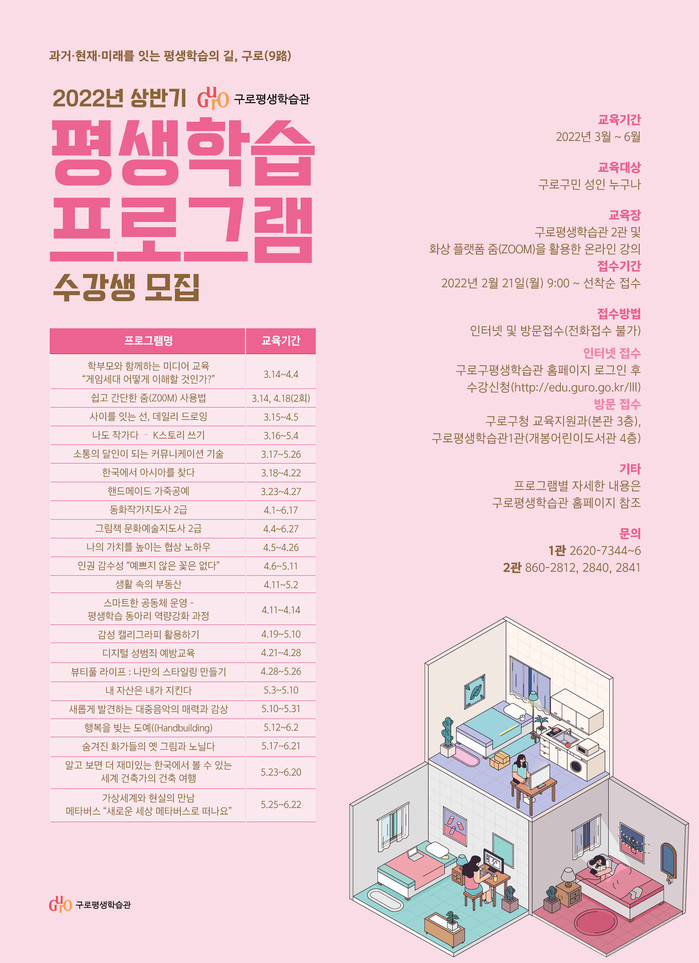 수강 대상은 지역내 주민, 직장인으로 참여를 원하는 이는 구로평생학습관 홈페이지를 통해 신청하거나 구청 교육지원과 또는 평생학습관을 방문하면 되고, 접수는 선착순이며, 수강료는 무료다.