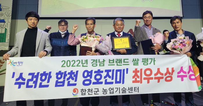 창원컨벤션센터(CECO)에서 진행된 ‘2022년 경남 브랜드 쌀 시상식’은 지난 9월 선정된 경남 브랜드 쌀 평가순위에 따라 도내 5가지 브랜드 쌀에 대해 시상했으며, ‘수[水]려한 합천 영호진미’는 2020년 ‘우수’, 2021년 ‘우수’에 이어 올해는 ‘최우수상’을 차지하는 쾌거를 거두었다.