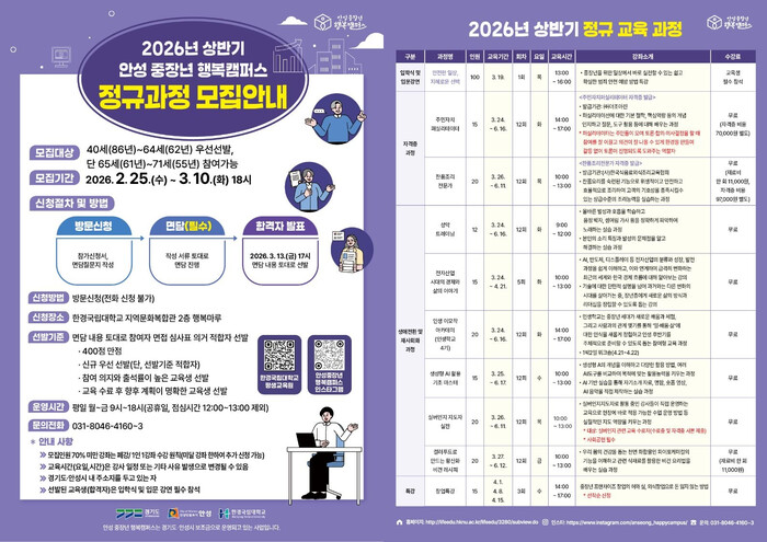 [안성=오왕석 기자] 안성 중장년 행복캠퍼스(한경국립대학교 평생교육원)는 2월 25일부터 3월 10일까지 ‘2026년 정규교육과정’ 수강생을 모집한다고 밝혔다.