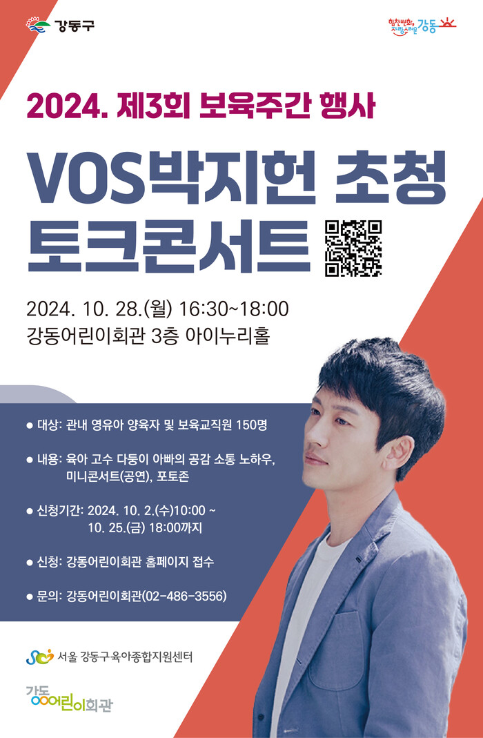 [시민일보 = 이대우 기자] 서울 강동구(구청장 이수희)가 오는 28일 강동어린이회관에서 양육자와 보육 교직원이 함께 즐길 수 있는 ‘vos 박지헌 초청 토크콘서트’를 개최한다.