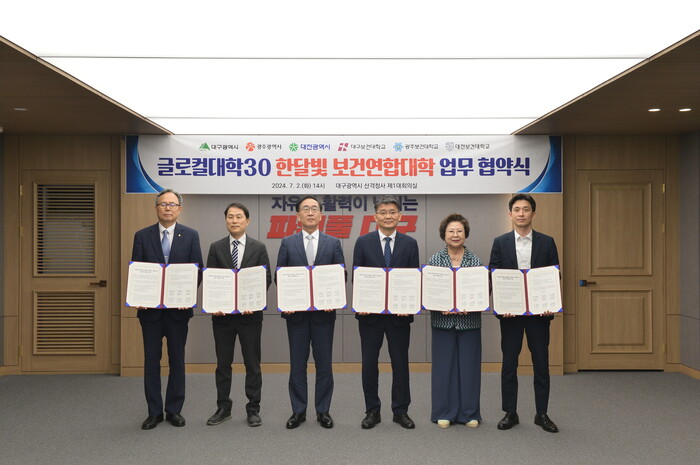 협약식에는 교육부의 ‘글로컬대학30’ 공모에 전국 유일 초광역 연합모델 유형으로 신청한 광주보건대학교, 대구보건대학교, 대전보건대학교 총장과 광주시‧대구시‧대전시 관계자들이 참석했다.