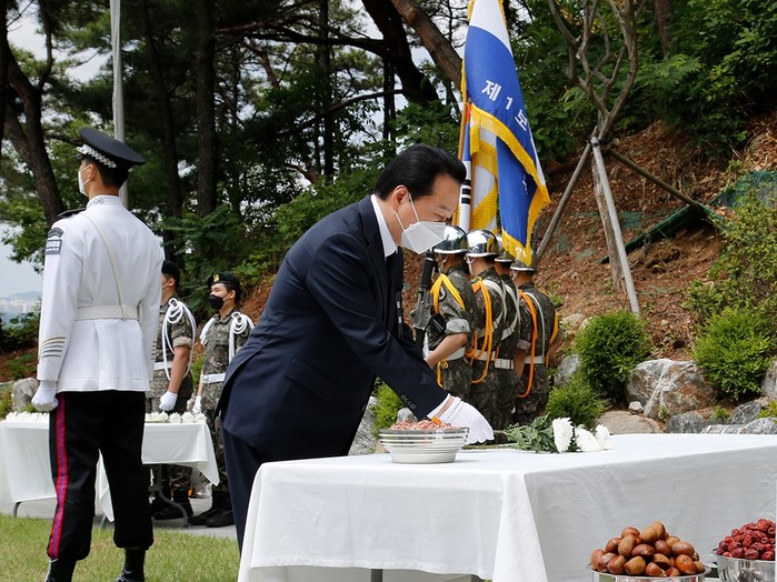 노현송 서울 강서구청장이 호국보훈의 달을 맞아 최근 열린 ‘제30회 개화산전투전사자 충혼 위령제’에 참석해 호국영령들의 숭고한 뜻을 기렸다. 충혼 위령제는 국민의례 및 묵념, 헌화 및 분양 등 순으로 진행됐다. 사진은 노 구청장이 위령제에 참석해 헌화하고 있는 모습. (사진제공=강서구청)