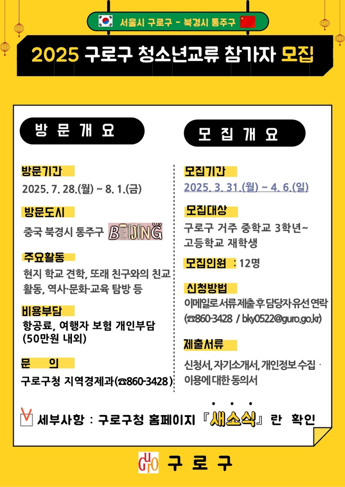 | ▲ 구로구-통주구 청소년 교류 프로그램 모집 안내문. (사진=구로구청 제공) |
