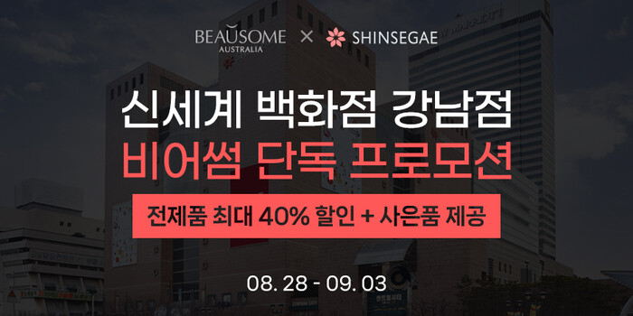 비어썸은 고객들에게 더 큰 혜택을 드리기 위해 입점 후 처음으로 40% 할인 이벤트를 진행한다. 첫 40% 할인 이벤트는 신세계 백화점 강남점에서 8월 28일부터 9월 3일까지 7일간 열린다.