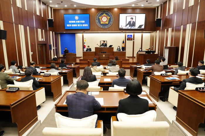 이번 정례회는 오는 12월16일까지 일정으로 열리며, 구의회는 지난 22일 열린 제1차 본회의에서 예산결산특별위원회 구성 결의안 등을 처리하고 내년도 예산안 제출에 따른 시정연설을 들었으며, 이경술 의원 ‘난방(복지) 취약 가구의 겨울철 대책, 보행자 빙판 사고 안전 대책’, 장연순 의원 ‘백화사 계곡 복원에 관한 내용’에 대한 5분 자유발언을 통해 구 발전을 위한 정책 제안 및 대책 마련을 촉구했다.