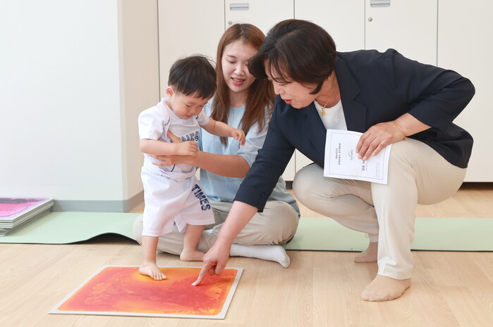 신계용 경기 과천시장이 최근 과천지식정보타운 프리즘스퀘어 1층으로 새롭게 이전한 과천시육아종합지원센터와 모두모여놀이섬 지식지점을 방문해 시설을 점검했다. 사진은 신 시장(오른쪽)이 과천시육아종합지원센터 프로그램에 참여하고 있는 모습. (사진=과천시청 제공)