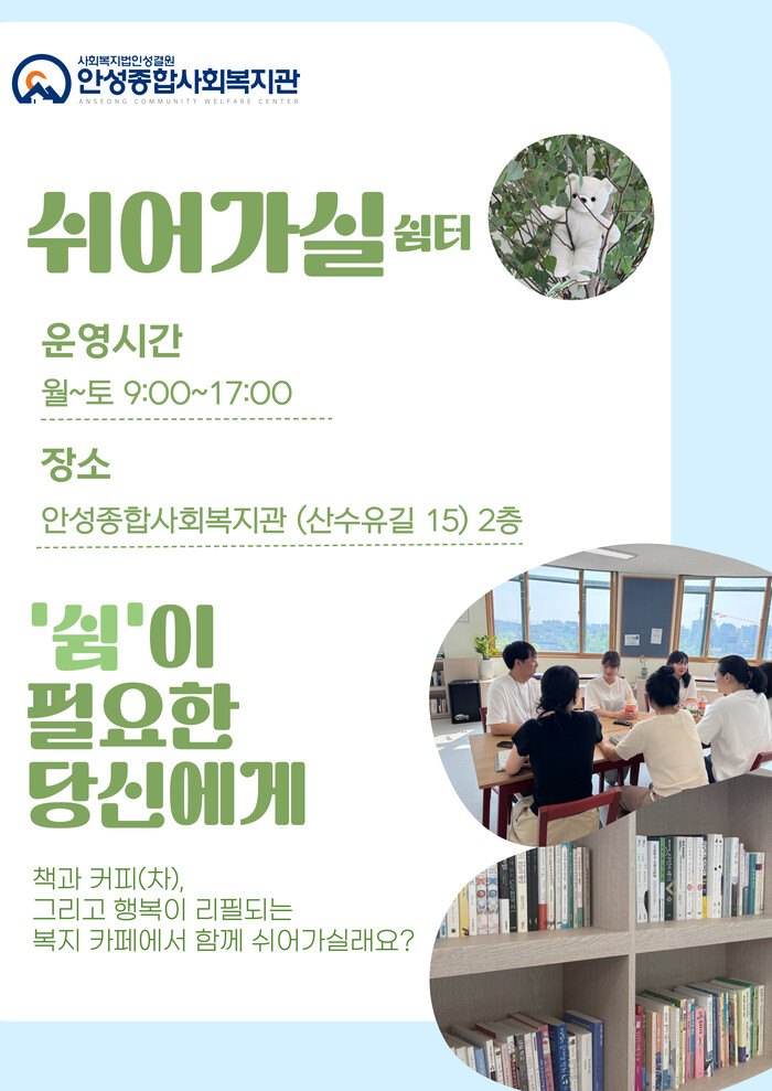 이번 사업은 안성시와 사회복지공동모금회에서 지원받아 「응답하라 2025 복지관 리프레쉬 - 쉬어가실」이라는 이름으로, 복지관 2층 공간을 개·보수하여 조성되었으며, 월요일부터 토요일까지 오전 9시부터 오후 5시까지 운영된다.