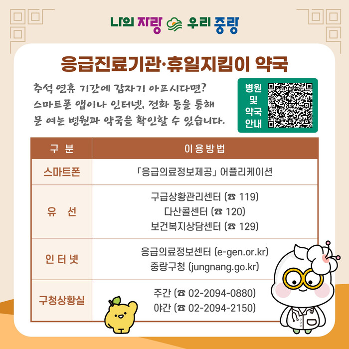 응급 진료가 가능한 의료기관과 약국 정보는 중앙응급의료센터 누리집, 중랑구청 누리집, ‘응급의료정보제공’ 앱으로 확인할 수 있으며, 구급상황관리센터와 다산콜센터를 통해 유선으로도 안내받을 수 있다.