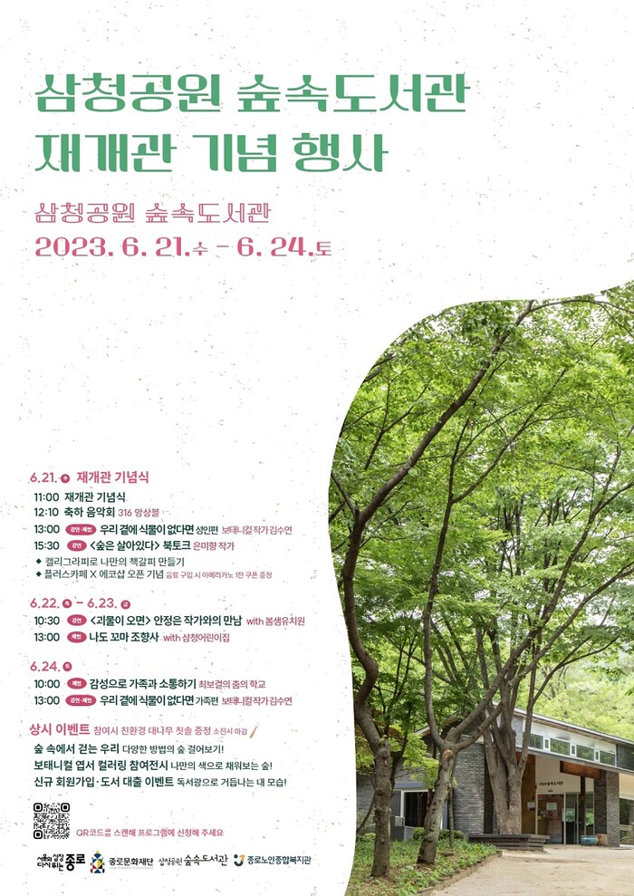 [시민일보 = 이대우 기자] 종로구(구청장 정문헌)가 21~24일 삼청공원 숲속도서관(북촌로 134-3) 재개관 기념행사를 개최한다.