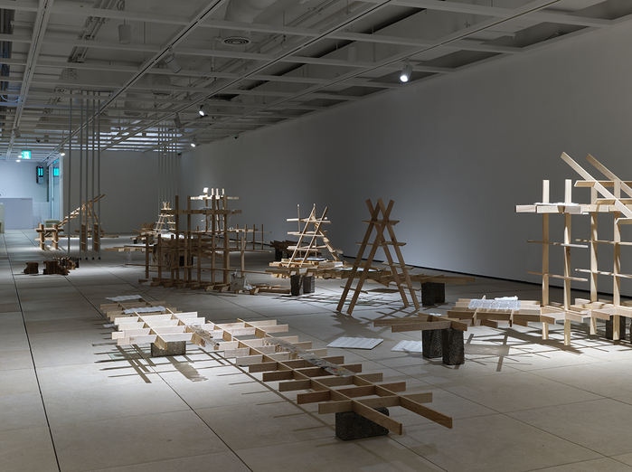[종횡도시 연작] 나무 격자가 수직의 마천루와 수평의 도로를 구성하며 대도시의 기본 틀을 보여준다. 격자 사이에는 휴지와 아크릴판 등 도시의 부산물이 담긴 소재가 다양한 파편 형태로 채워져, 도시 구조가 완성되지 않고 끊임없이 변화함을 드러낸다.