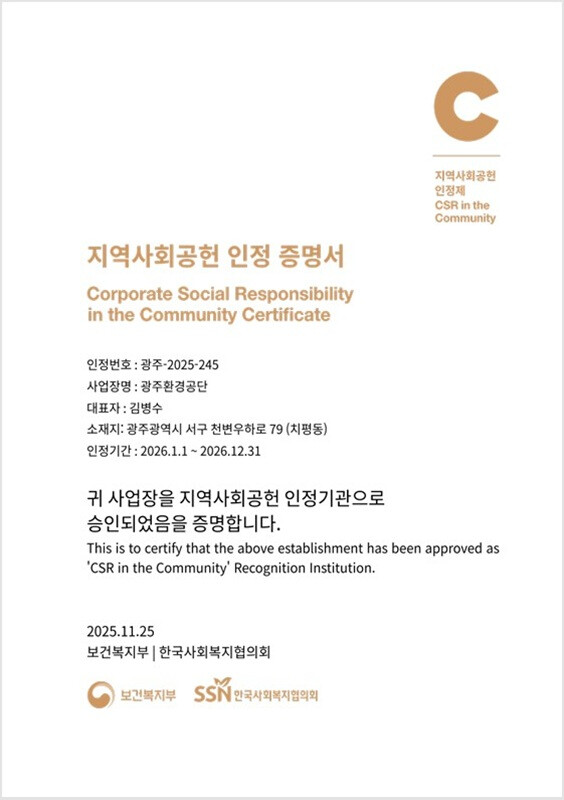 | ▲ 지역사회공헌 인정 증명서 / 광주환경공단 제공 |