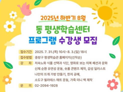 [시민일보 = 여영준 기자] 서울 중랑구(구청장 류경기)가 오는 8~12월 구민을 위한 하반기 평생학습 프로그램을 운영한다.