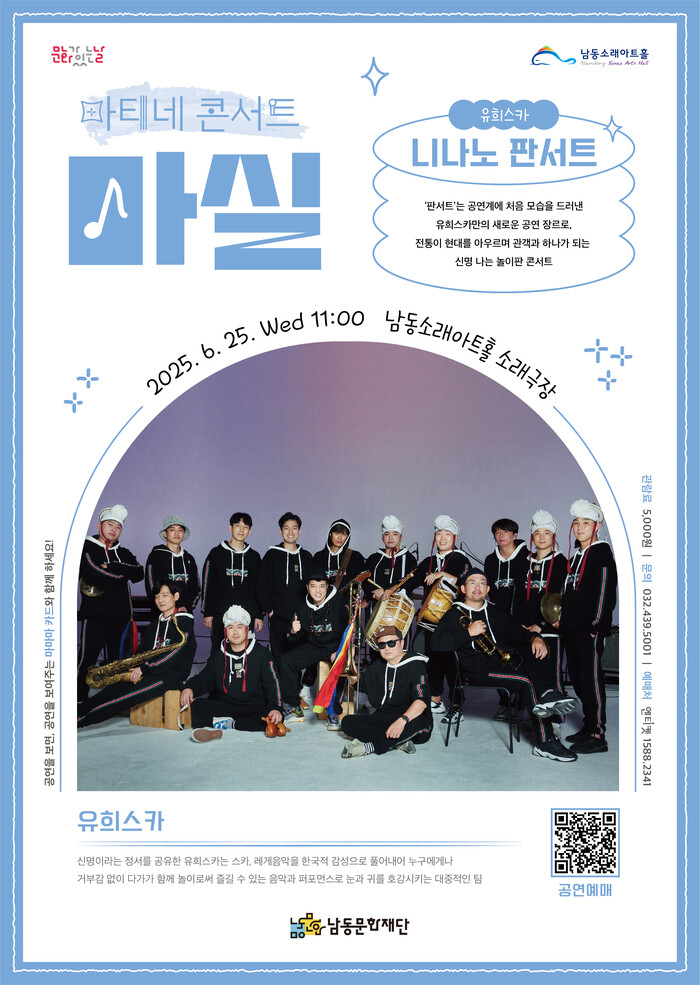 [인천=문찬식 기자] 인천 남동구 남동문화재단은 소래아트홀 상설 프로그램인 ‘2025 마티네콘서트 마실’로 유희스카의 ‘니나노 판서트’를 개최한다고 12일 전했다.