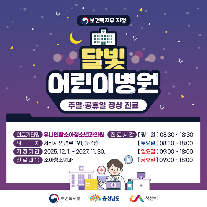 시에 따르면 충남도 15개 시ㆍ군 중에서 영유아 야간진료센터와 달빛어린이병원이 동시 운영되는 곳은 서산시가 유일하다.