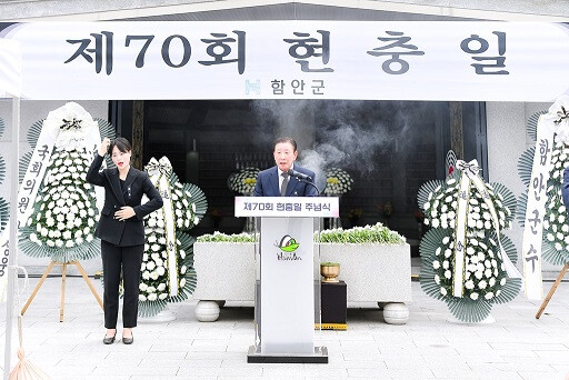이날 추념식에는 조근제 함안군수를 비롯해 도의원, 군의원, 8개 보훈단체장, 국가유공자 및 유가족, 관내 기관·단체장, 육군제39보병사단 함안대대장과 지역대장, 각급 학교 학생대표, 일반 군민, 공무원 등 500여 명이 참석해 순국선열과 호국영령의 숭고한 희생정신을 기렸다.