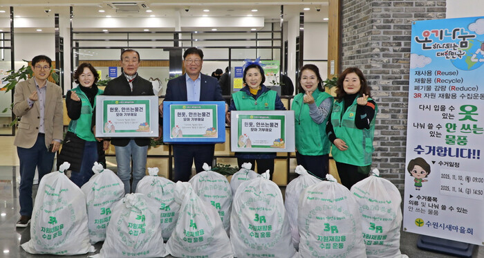 경기 수원시 팔달구 새마을부녀회가 지난 7일 주민들과 함께 모은 헌옷을 전달하며 올해 세 번째로 진행된 ‘헌옷·재사용 물품 모으기 운동’을 마무리했다. 사진은 전달식에 참석한 이상균 구청장(가운데)이 참석자들과 기념촬영을 하고 있는 모습. (사진=팔달구청 제공)