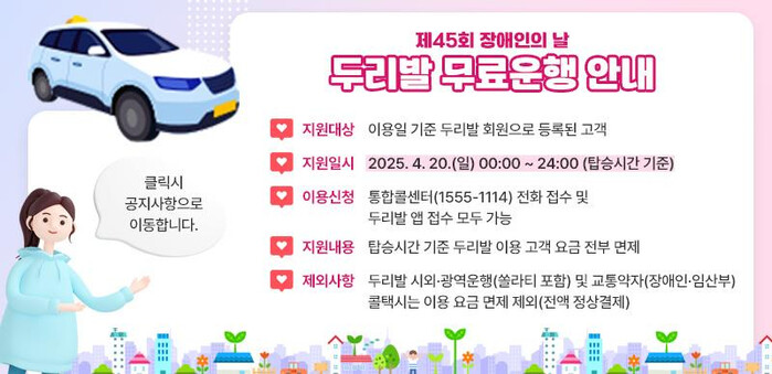 이번 무료 운행은 탑승 시간 기준으로 장애인의 날(4월 20일) 당일 오전 0시부터 자정까지 하루 동안 두리발 등록 장애인들을 대상으로 지원된다.