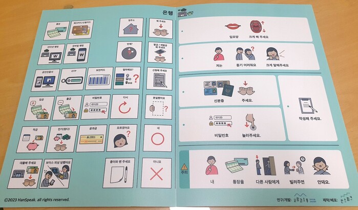 이 그림·글자판에는 '신분증 주세요', '비밀번호를 눌러 주세요', '저는 듣기 어려워요. 크게 말해 주세요', '입 모양을 크게 해 주세요', '보이스 피싱 당했어요' 등 은행원과 고객 사이에 오갈 수 있는 대화 내용이 그림과 함께 담겨 있다.
