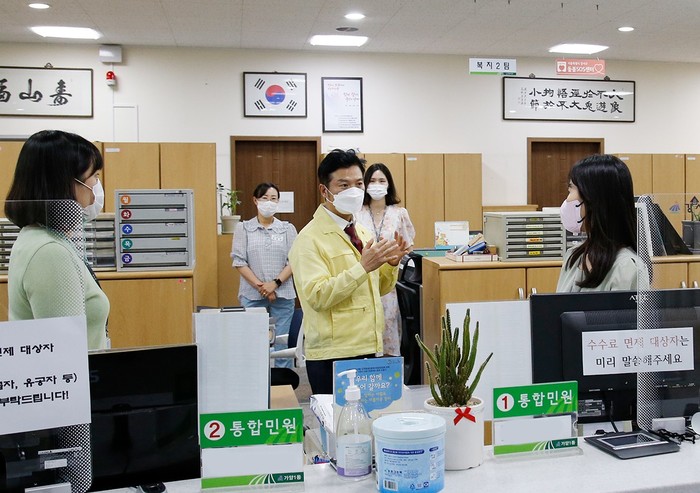 김태우 강서구청장은 최근 화곡3·8동, 가양1·2동, 우장산동 주민센터를 찾아 직원들을 격려했다. 사진은 김 구청장(가운데)이 가양1동 주민센터를 찾아 직원들을 격려하고 있는 모습. (사진제공=강서구청)