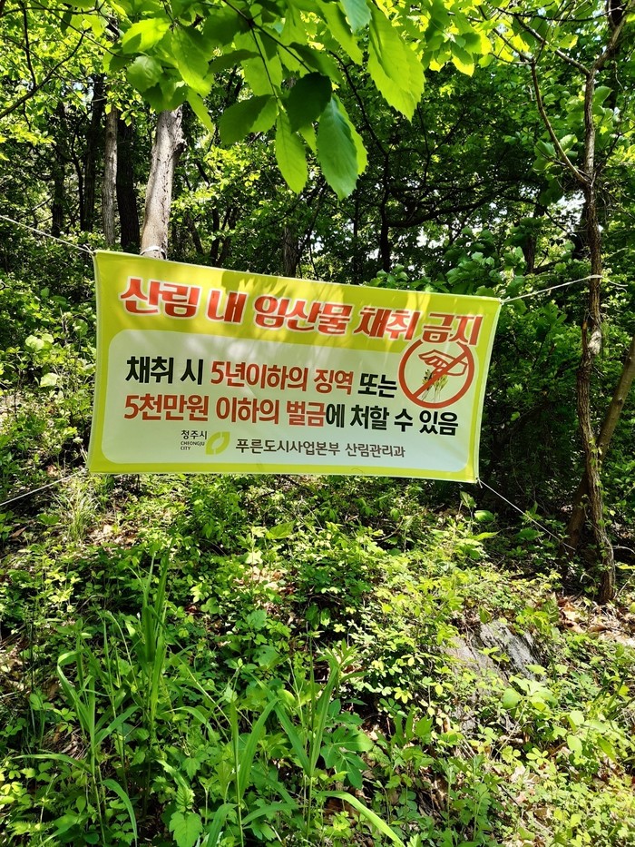 청주시는 주요 장소에 임산물 불법채취 금지 현수막을 게시하고, 지역 내 산림·등산로 주변을 대상으로 산나물·산약초 채취 등 불법 임산물 채취행위 특별단속을 실시한다.