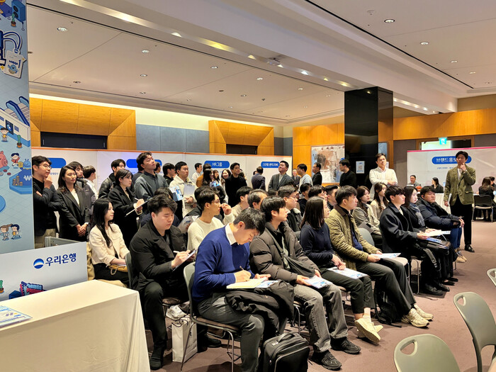 | ▲ 지난 24일 삼성동 코엑스에서 개최된 ‘Woori Career EXPO 2nd’에 참석한 우리은행 직원들이 관심있는 사업그룹의 현직자에게 상담을 받고 있다. (사진=우리은행 제공) |
