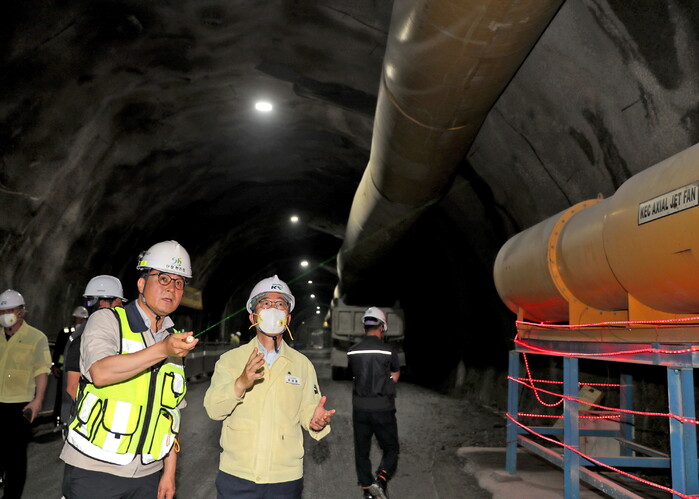| ▲ 유성훈 구청장이 신안산선 건설공사 현장에서 공사 진행 상황을 점검하고 있다. (사진=금천구청 제공) |
