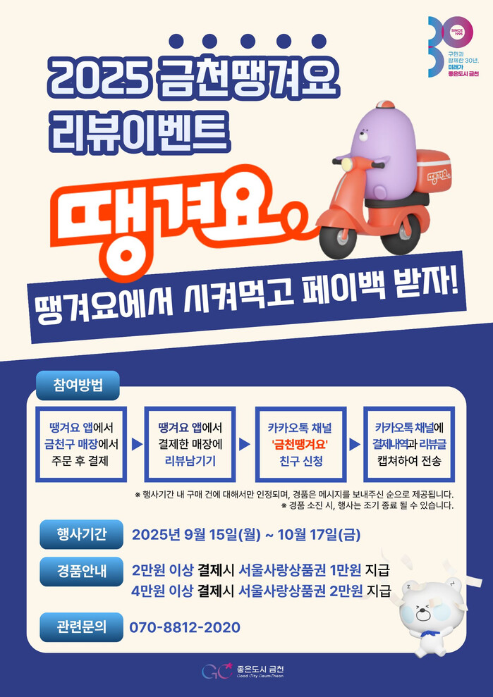 또한 10월 17일까지는 ‘금천땡겨요 리뷰 이벤트’도 함께 진행된다. 땡겨요 앱으로 음식을 주문한 뒤 카카오톡 채널 ‘금천땡겨요’에 리뷰를 작성하면 주문 금액에 따라 서울사랑삼품권을 지급한다. 2만원 이상 결제 시 1만원, 4만원 이상 결제 시 2만원을 페이백 형식으로 돌려받을 수 있으며, 예산 소진 시 조기 종료된다.