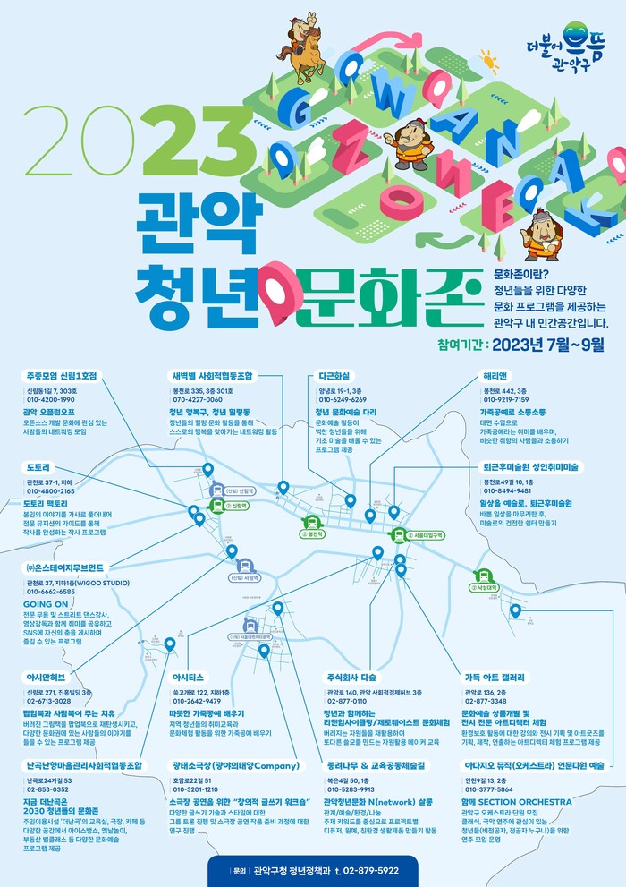 [시민일보 = 여영준 기자] 서울 관악구(구청장 박준희)는 ‘2023년 관악 청년 문화존’으로 선정된 민간 문화공간에서 오는 9월까지 청년들을 위한 다양한 문화예술 프로그램을 운영한다고 11일 밝혔다.