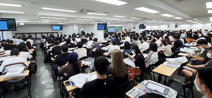 | ▲ 서울 노량진의 공단기 강의실에서 진행된 ‘찾아가는 공무원 합격 설명회’에 참석한 수험생들이 2023 공무원 시험 대비에 대한 설명을 듣고 있다. (사진제공=에스티유니타스) |