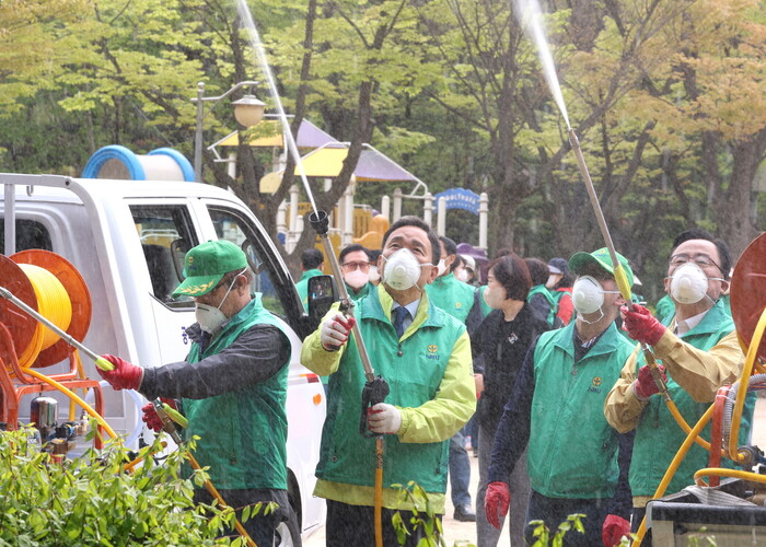 | ▲ 지난 4월 새마을방역봉사대 발대식에서 방역활동을 하는 조성명 구청장(왼쪽 두 번째). (사진=강남구청 제공) |