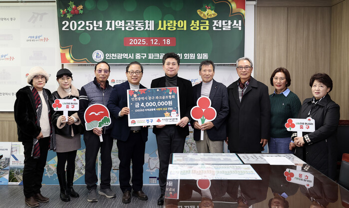 [인천=문찬식 기자] 인천 중구(구청장 김정헌)는 최근 ‘인천광역시 중구 파크골프협회(회장 조고호)’가 지역 취약 계층 지원을 위해 지역공동체 사랑의 성금 400만 원을 기탁했다고 밝혔다.