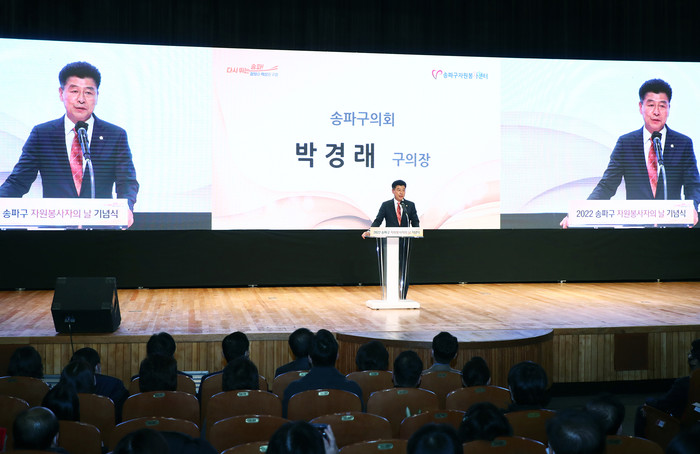 [시민일보 = 이대우 기자] 박경래 서울 송파구의회 의장이 최근 송파구민회관 3층 대강당에서 열린 ‘2022 송파구 자원봉사자의 날’ 기념식에 참석했다.