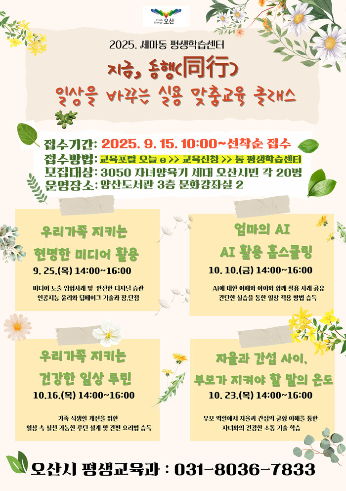 교육 신청은 지난 15일부터 오산시 교육포털 ‘오늘e’를 통해 접수받고 있으며, 교육과정별로 20명을 선착순 모집한다.