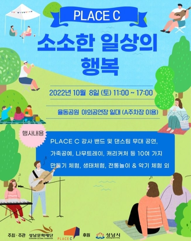 오는 10월 8일(토) 오전 11시부터 분당 율동공원 내 야외무대 일원에서 열리는 성남생활문화공간 PLACE C 성과 보고 행사는 7개 거점별 부스 운영과 사랑방문화클럽과 PLACE C 강사밴드 등 시민예술동호회의 공연 등이 이어진다.