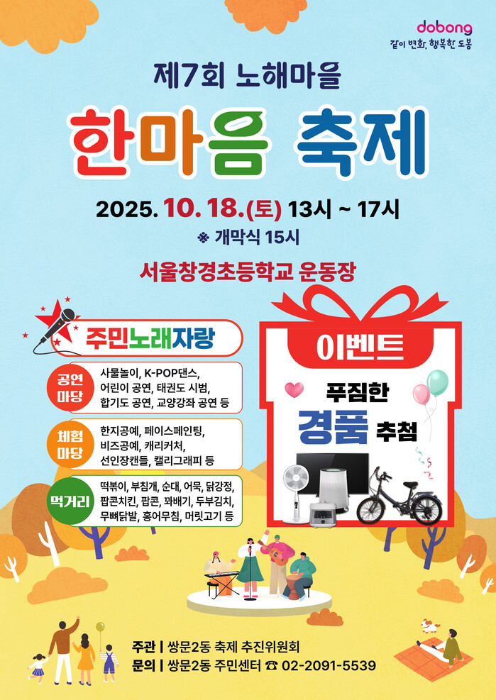 [시민일보 = 문민호 기자] 도봉구(구청장 오언석) 쌍문2동이 10월 18일 오후 1시 서울창경초등학교에서 ‘제7회 노해마을 한마음 축제’를 개최한다.
