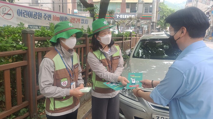 | ▲ 서초금연코칭단원들이 서초3동 한 어린이공원 주변에서 흡연자들을 계도하며 금연클리닉을 안내하고 있다. (사진=서초구청 제공) |