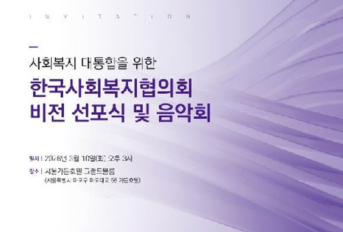 [시민일보=문찬식 기자] 한국사회복지협의회가 오는 10일 오후 3시 서울가든호텔 그랜드볼룸에서 사회복지 대통합을 위한 비전 선포식 및 음악회를 개최한다.