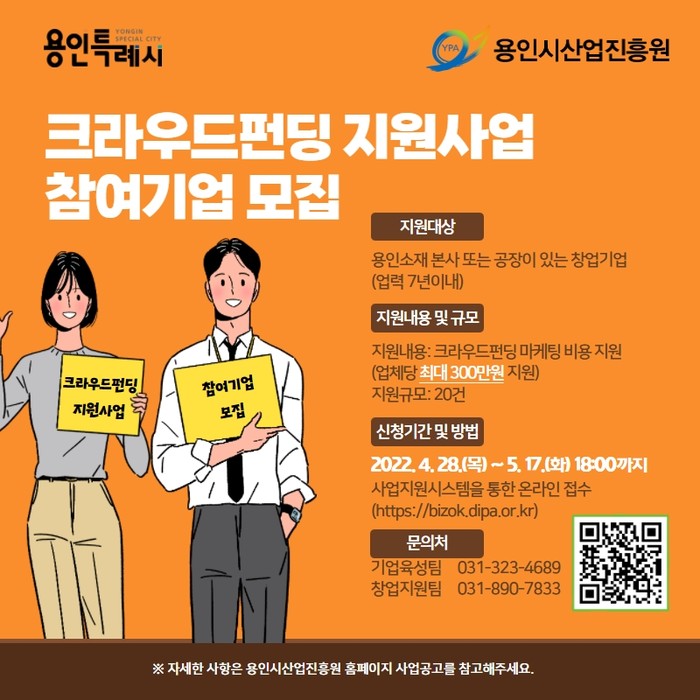 [용인=오왕석 기자] 용인시산업진흥원은 용인에 소재하고 있는 설립 7년 이내 초기창업기업을 대상으로 ‘크라우드펀딩 지원사업’을 추진한다고 밝혔다.