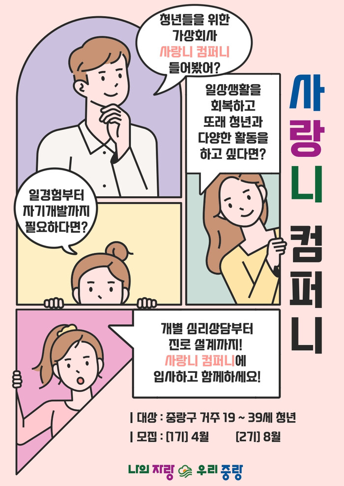 ‘사랑니 컴퍼니’는 ‘사회로 돌아오랑, 중랑 니트청년’의 줄임말로, 사회 진입 과정에서 어려움을 겪는 청년들에게 손 내미는 회사라는 의미를 담고 있다. 구는 이 사업을 통해 고립·은둔·니트 청년들의 일상을 회복시키고, 또래와의 지속적 교류를 통해 사회로의 복귀를 지원한다.