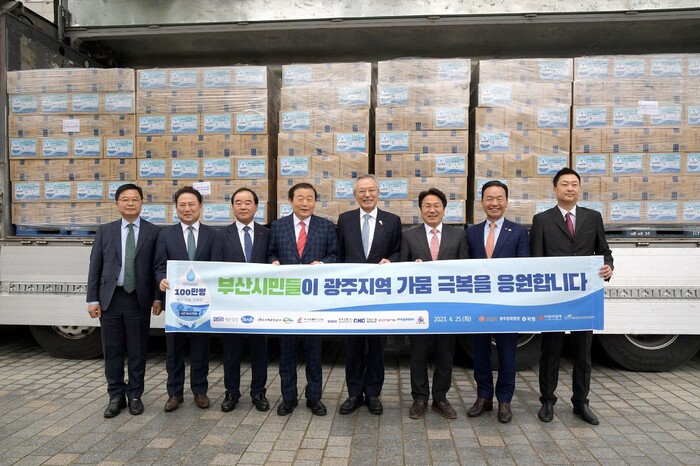 광주광역시(시장 강기정)는 25일 시청에서 부산지역 기업 대표, 광주MBC, 광주사회복지공동모금회와 함께 ‘부산시민, 가뭄 극복 생수 기부 전달식’을 개최했다.