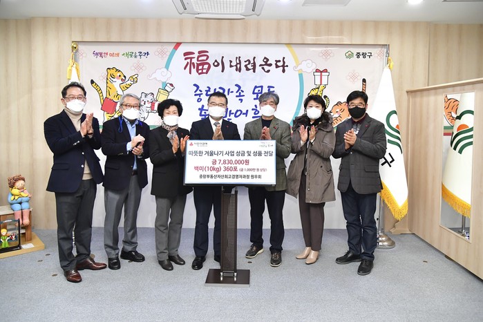 중랑구는 지난 12일 ‘중랑부동산자산최고경영자과정’ 원우생들로부터 2022 희망온돌 따뜻한 겨울나기 성금 783만원과 1000만원 상당의 백미(10kg)를 전달받았다. 전달받은 성금품은 서울사회복지공동모금회를 통해 지역내 어려운 가정에 전달될 예정이다. 사진은 전달식에서 류경기 구청장(가운데)과 관계자들이 기념촬영을 하는 모습. (사진제공=중랑구청)